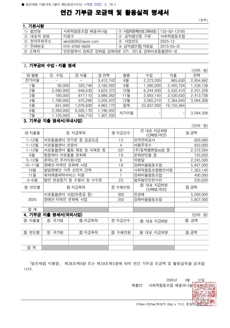 2025 연간 기부금 모금액 및 활용실적 명세서 공지